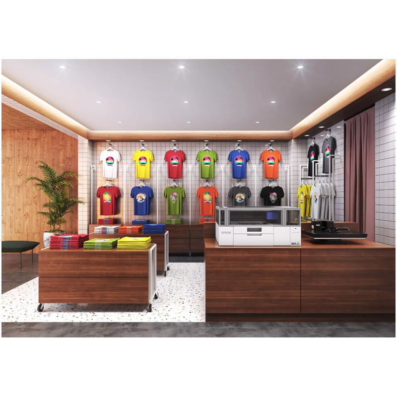 Amb la capacitat d'imprimir en diversos teixits, com ara cotó, niló, cuir, polièster, denim i barreges 50/50, aquesta impressora és perfecta per als serveis habituals a la botiga, com la impressió personalitzada de peces de roba en temps real.