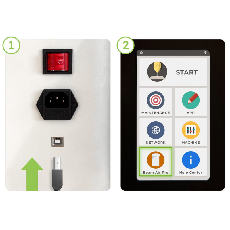 Connexió i monitoratge automàtics: en connectar-lo via USB-B amb la talladora, s’encén i s’apaga automàticament; mostra l’estat dels filtres al panell de la màquina i encén una llum indicadora quan cal substituir algun filtre.