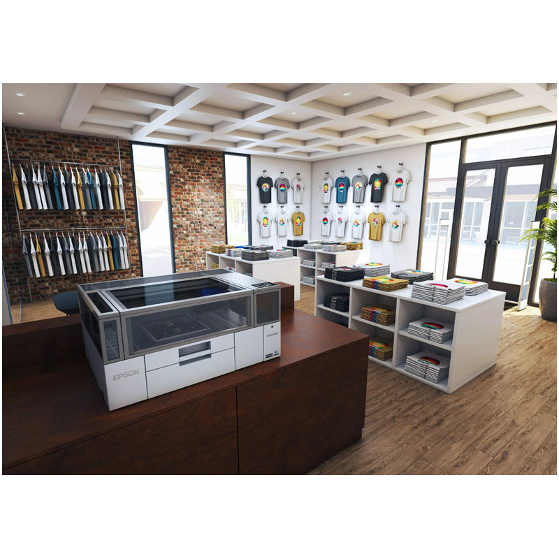 Con la capacidad de imprimir en diversos tejidos, como algodón, nylon, cuero, poliéster, denim y mezclas 50/50, esta impresora es perfecta para los servicios habituales en tienda, como la impresión personalizada de prendas en tiempo real.