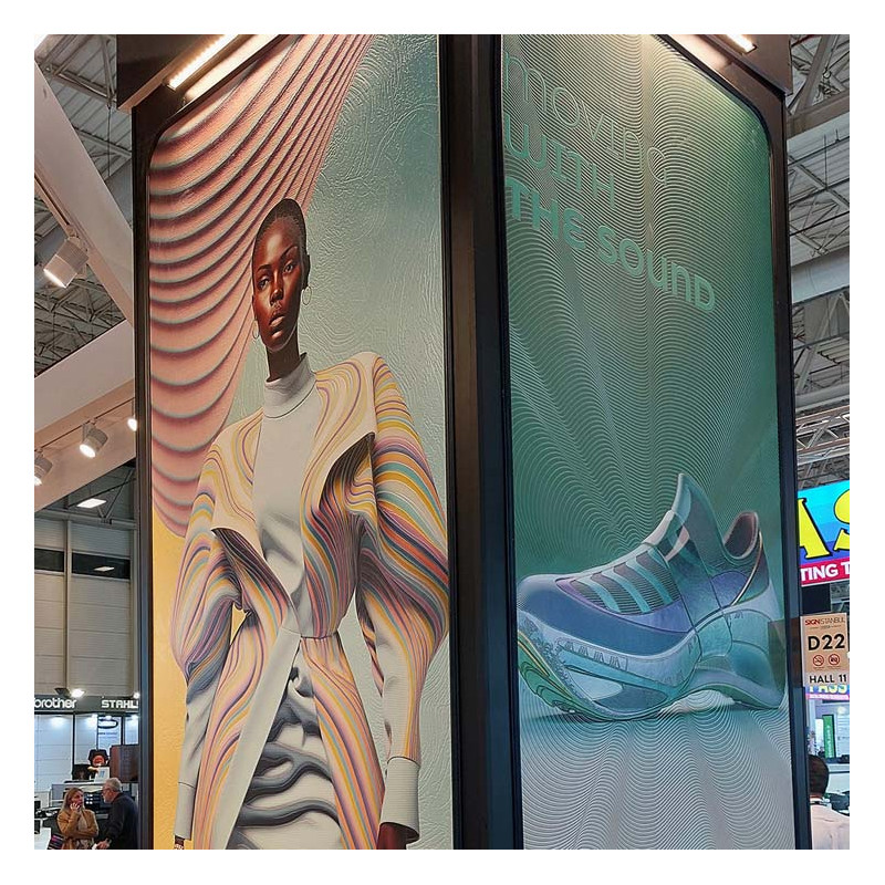 DIMENSE combina materiales y tintas avanzados para crear impresiones tridimensionales en un solo paso. Ofrece opciones con acabados variados, como mate, ante, oro o camaleón. Las imágenes pueden alcanzar hasta 1,5 mm de relieve y 1,58 m de ancho, creando un impacto visual y táctil sin igual.