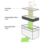 | Sistema de filtrado | 3 capas: Prefiltro, Filtro intermedio H13, Filtro avanzado (Carbono activo + U16) |