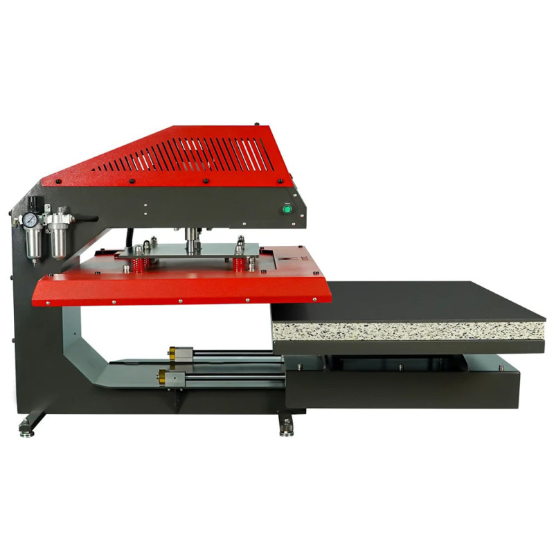 Su platen de 80 × 100 cm permite trabajar piezas de gran tamaño como textiles, banners, paneles rígidos o materiales para sublimación. El sistema neumático asegura una presión constante y repetible, reduciendo el esfuerzo del operario y mejorando la calidad del acabado final.