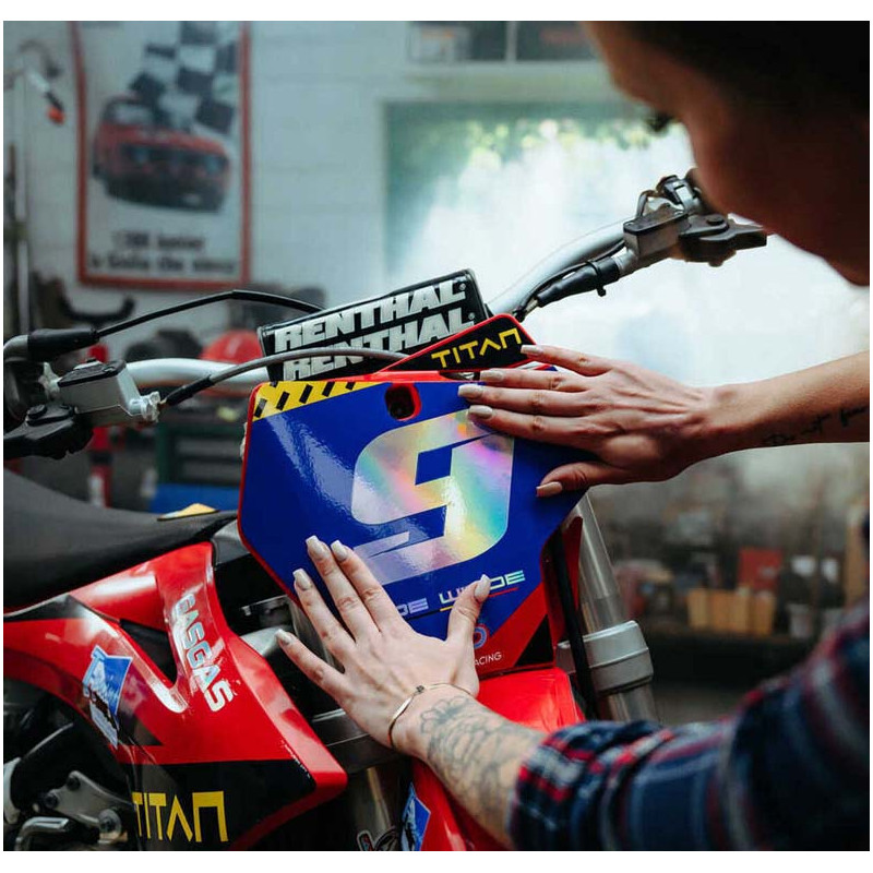 Descubre el vinilo holográfico plata TITAN THSX-110, desarrollado especialmente para crear gráficos llamativos en motocicletas de cros y otros powervehicles.